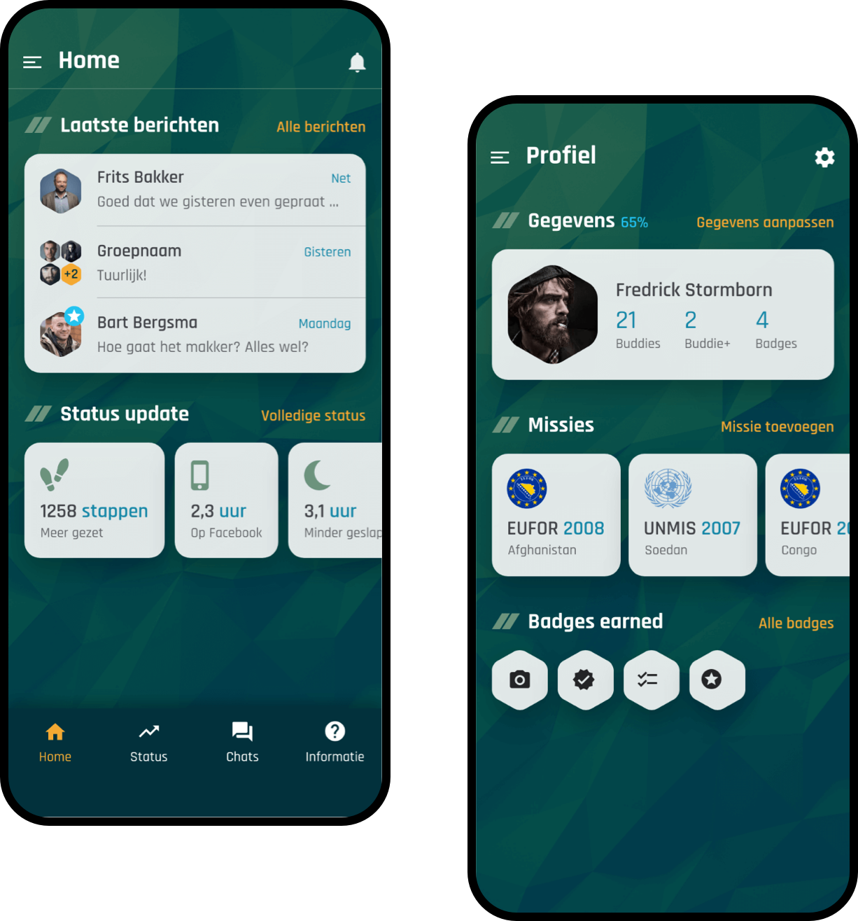 The app has become a secure online meeting place, with all kinds of extras such as relevant information, news and events. If someone is not doing well mentally, he or she can use the app to find former colleagues with whom he or she can talk about their feelings. Also, within the app, direct contact can be made with agencies and primary health care workers. The long-term objective is to identify mental complaints among veterans at an early stage and thus to limit the course of the illness.